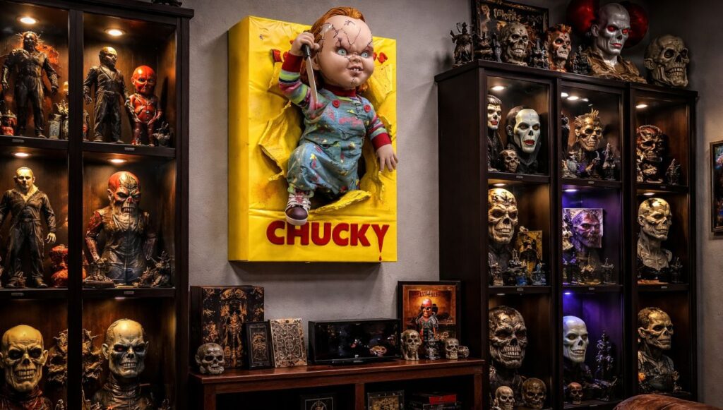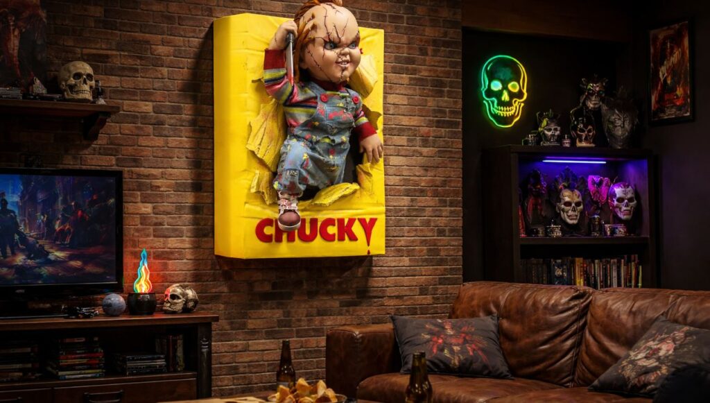 Er zijn genoeg Chucky-collectibles te vinden, van kleinere beeldjes tot busts en poppen. En die hebben allemaal hun charme. Maar meestal zit je bij die items toch in één van deze categorieën: óf ze zijn te klein om echt impact te maken, óf ze zijn groot maar vragen een vaste plek en voelen meer als museumstuk dan als onderdeel van je ruimte.