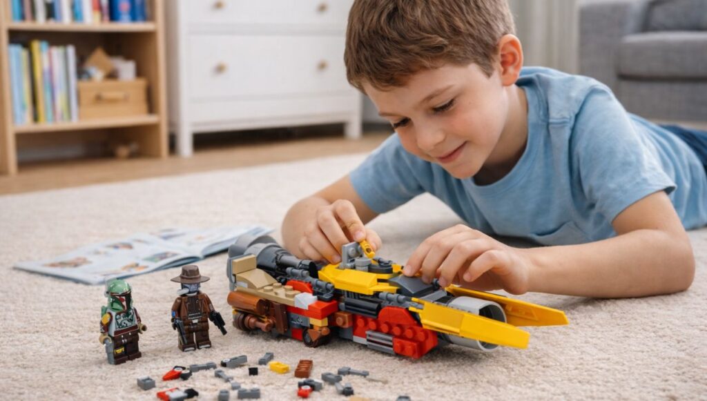 Wat deze set leuk maakt, is dat niet alles meteen zichtbaar is. Tijdens het bouwen ontdek je een verborgen compartiment in de speeder. Daarin zitten accessoires zoals Boba Fett’s helm en een pak bantha melk. Dat klinkt misschien als een klein detail, maar juist dat soort dingen zorgen ervoor dat je de set blijft oppakken.