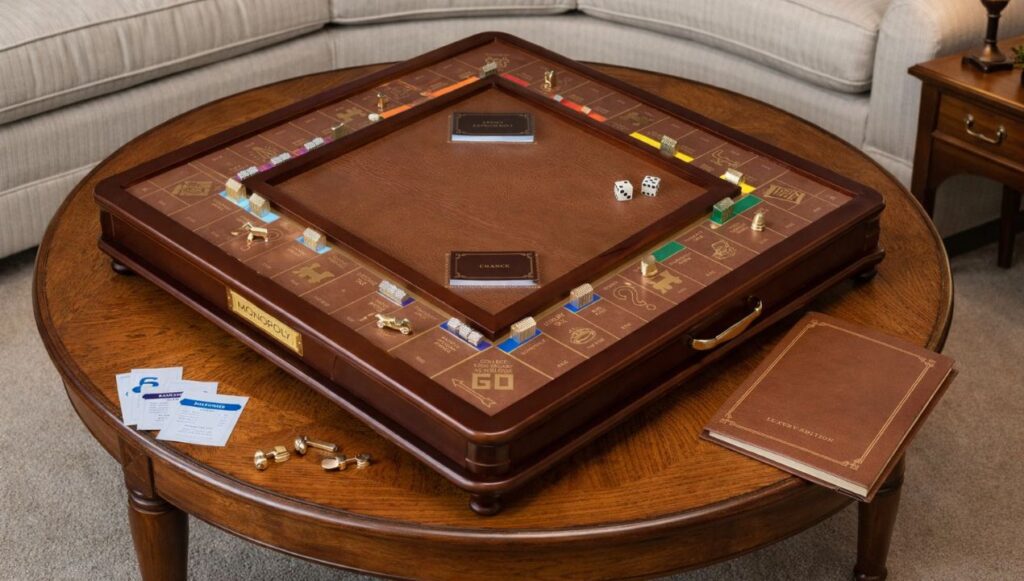 Als je Monopoly kent zoals de meesten het kennen, denk je waarschijnlijk aan een dun kartonnen doos, gevouwen speelbord en plastic pionnen die na verloop van tijd verdwijnen onder de bank. Deze editie gooit dat beeld volledig om. Alles aan dit spel voelt doordacht, zwaar en bedoeld om lang mee te gaan. Het woord “erfstuk” klinkt misschien groot, maar hier voelt het verrassend passend.