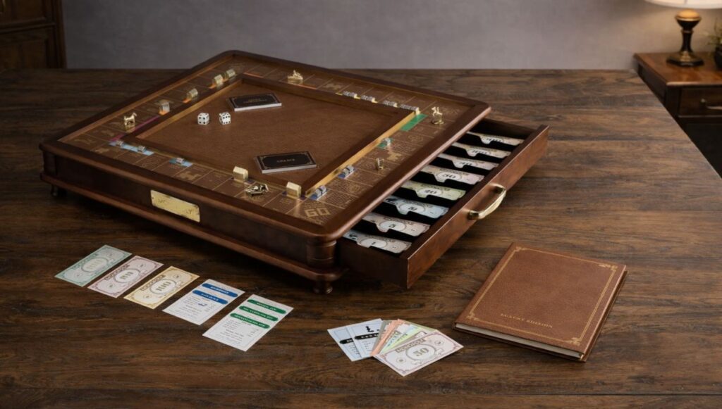 Er zijn meerdere luxe Monopoly-edities op de markt geweest, vaak met een hogere prijs en een paar extra details. Denk aan leren speelborden of speciale thema-uitgaven. Wat hier anders is, is de samenhang. Alles klopt met elkaar. Niets voelt als een los toegevoegd luxe-element.