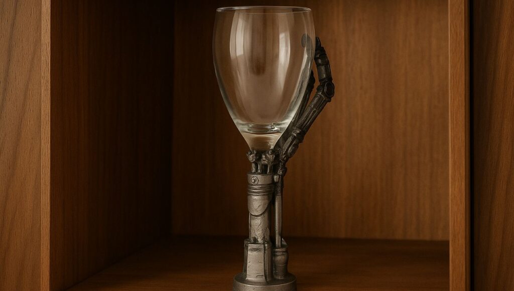 Toen ik de Terminator-kelk voor het eerst uit de verpakking haalde, was mijn eerste gedachte: dit ding is zwaar. Niet in de zin van onhandelbaar, maar je voelt meteen dat het niet zomaar een plastic gimmick is. De kelk is gemaakt van resin (hars) met een glazen binnenkant, en die combinatie zorgt voor een degelijke, bijna luxe uitstraling. De hand van de T-800 compleet met hydraulische details, metalen structuur en zichtbaar mechanisme – oogt bijna levensecht.