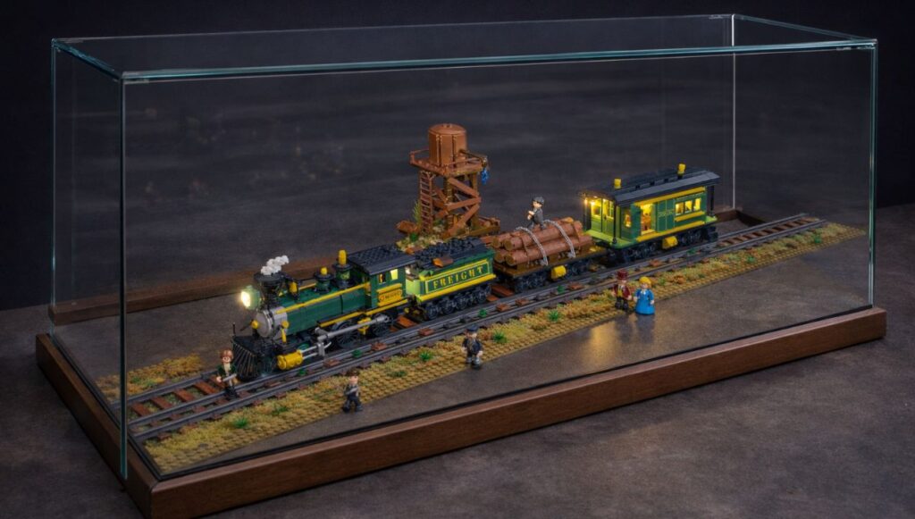 Wat hier meteen opvalt, is dat dit geen speelgoed achtige trein is die je na het bouwen in een doos stopt. Dit is een bouwset die je neerzet, waar je naar blijft kijken en waarbij je steeds weer nieuwe details ontdekt. Met 1524 onderdelen, een klassieke 4-4-0 stoomlocomotief, verlichting, rails, een watertoren en zes minifiguren voelt het meer als een compleet diorama dan als “gewoon een set”.