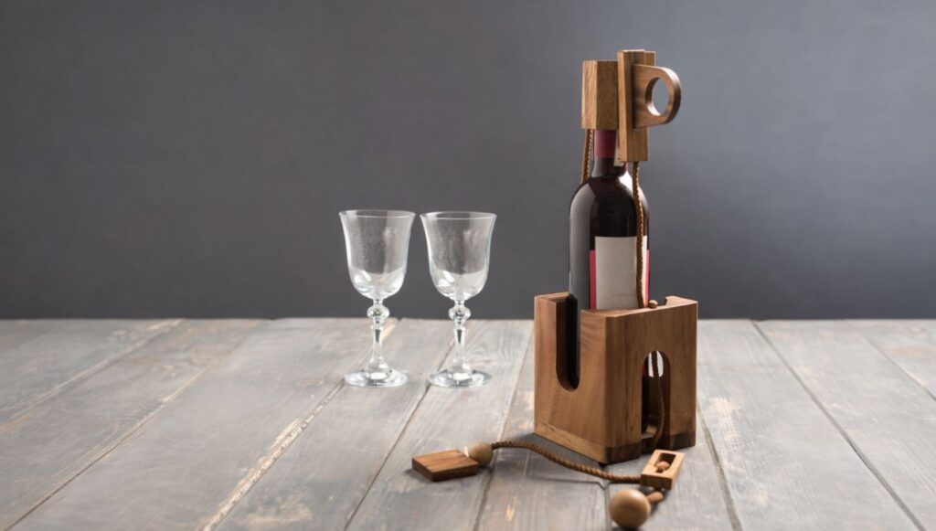 Vanaf het moment dat je de wijnfles puzzel in handen hebt, merk je dat het niet zomaar een gimmick is. Het hout voelt stevig, niet ruw, niet fragiel. Het touw oogt simpel, maar laat je niet misleiden. Dit is zo’n constructie waarbij je in eerste instantie denkt: “Dat heb ik zo door.” En dan, vijf minuten later, zit je nog steeds te staren alsof de puzzel je persoonlijk uitdaagt.