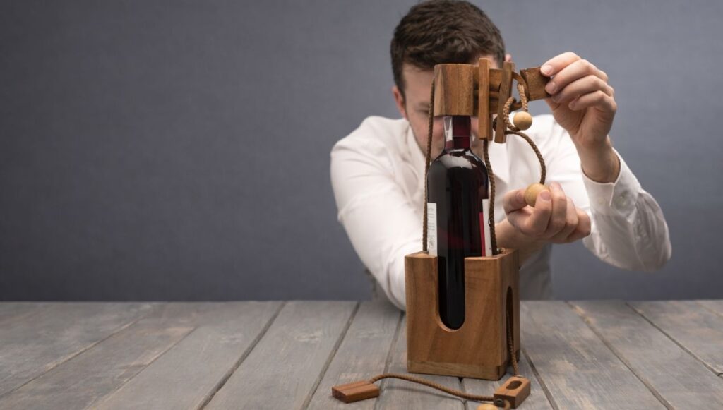 Vergeleken met metalen wijnsloten die ik eerder heb gezien, waarbij je vaak één specifieke beweging moet kennen, voelt deze puzzel eerlijker. Je kunt logisch redeneren, teruggaan, opnieuw proberen. Het draait minder om een trucje en meer om inzicht.