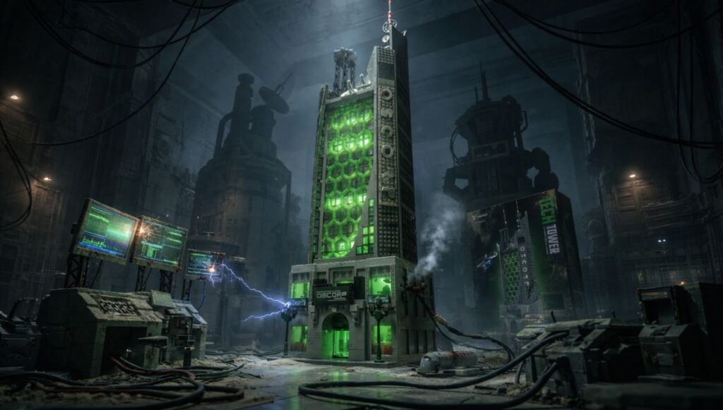 Wat deze set echt onderscheidt, is het interieur. Je krijgt niet alleen een dichte toren met wat decoratie, maar een volledig uitgewerkte binnenkant met meerdere niveaus. Denk aan een lobby, kantoren, laboratoria en technische ruimtes. Elke verdieping heeft zijn eigen sfeer.